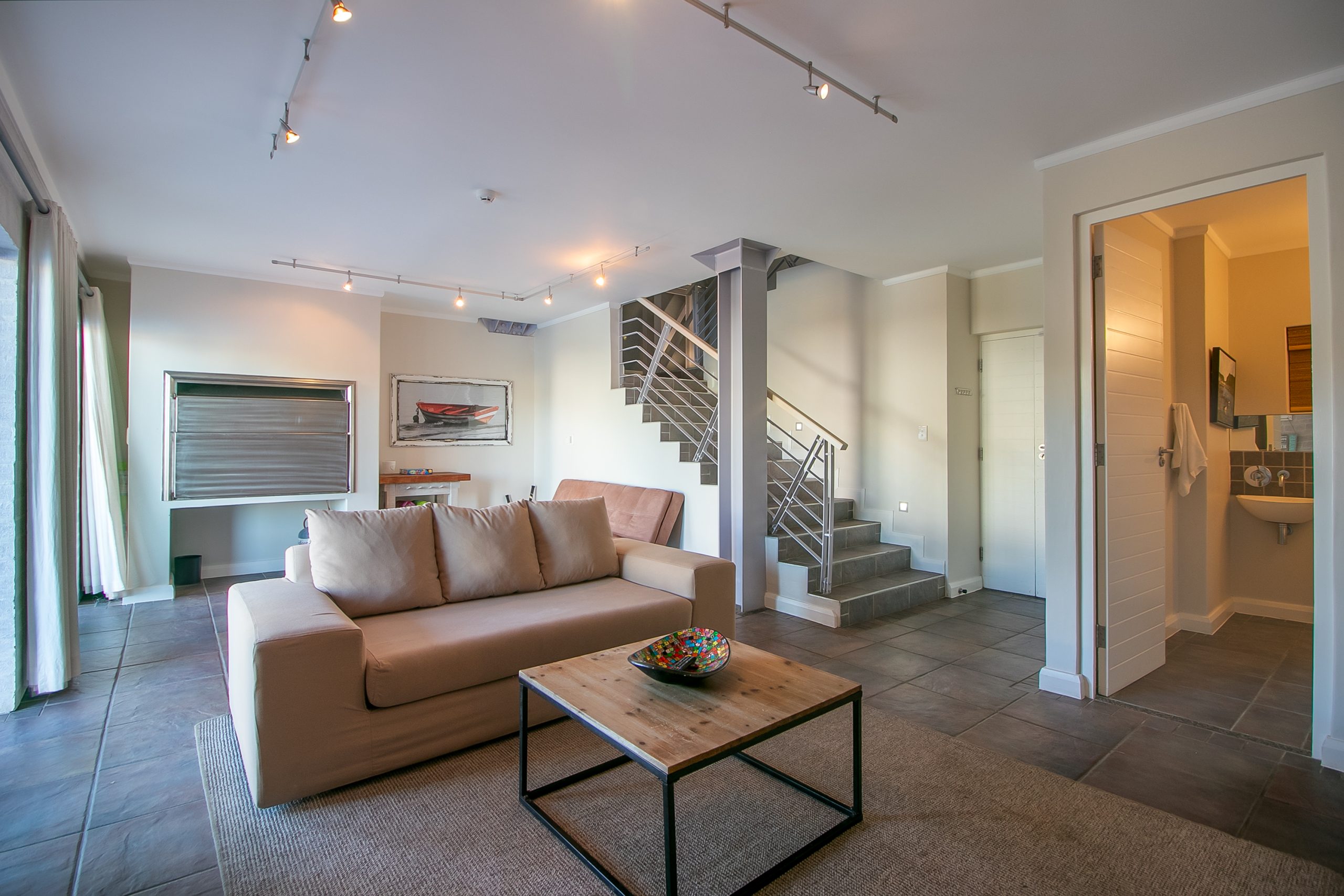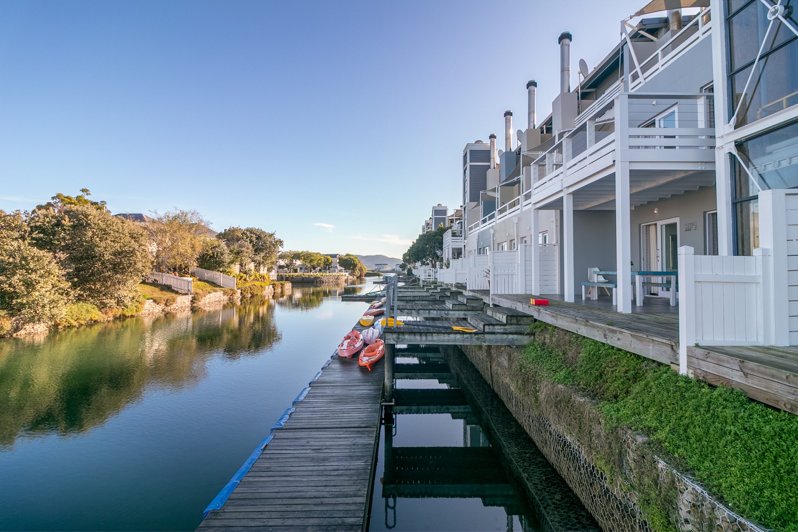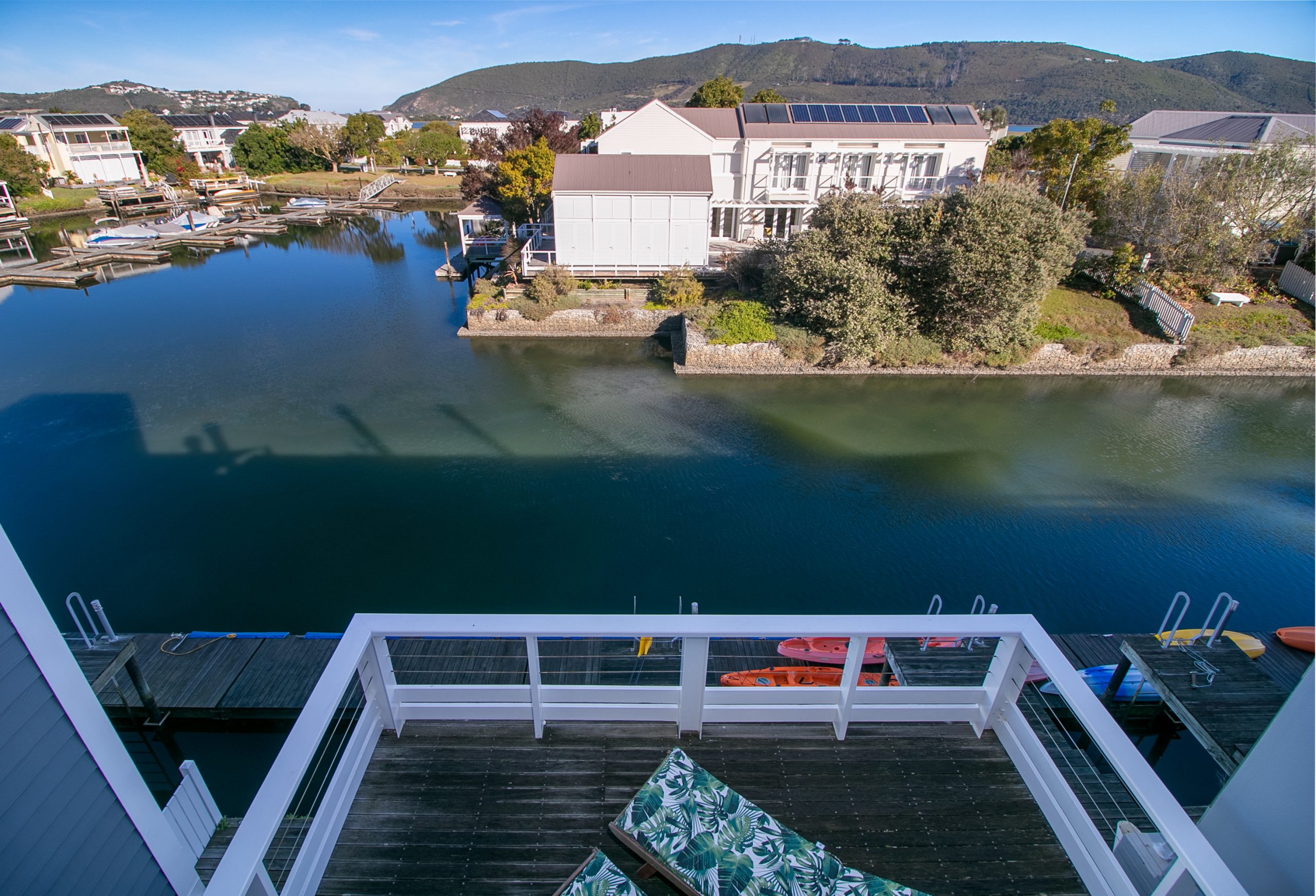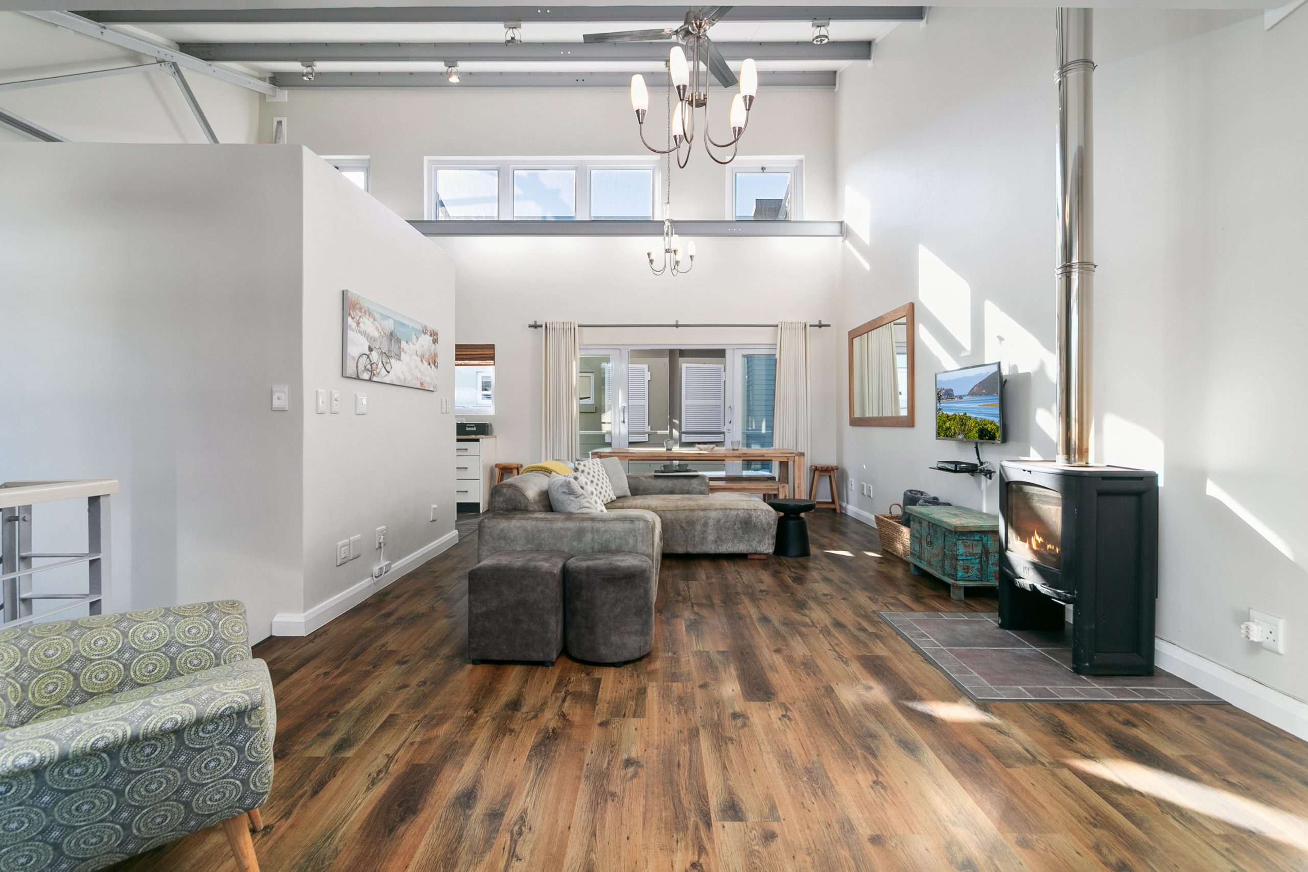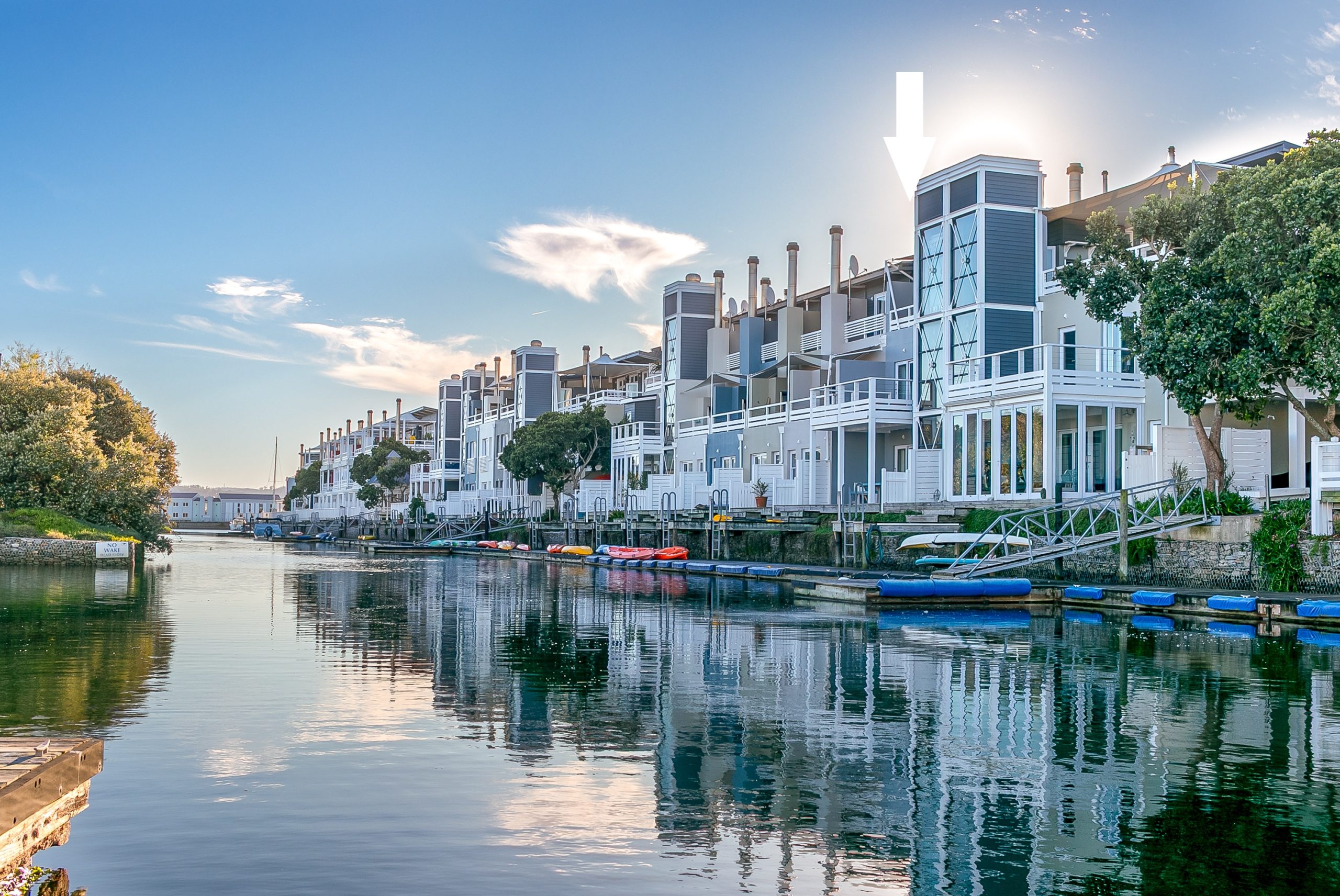 Designed to impress, the top floor boasts a light and airy open-plan living area with double-volume ceilings and windows that flood the space with natural light. A modern combustion fireplace adds warmth and charm, while stacking doors open on both sides to a covered verandah and a generous entertainment balcony—complete with another built-in stainless steel braai and panoramic views of the canals. The kitchen, thoughtfully tucked to the side, includes a private scullery and benefits from the natural light pouring through the high-level windows.