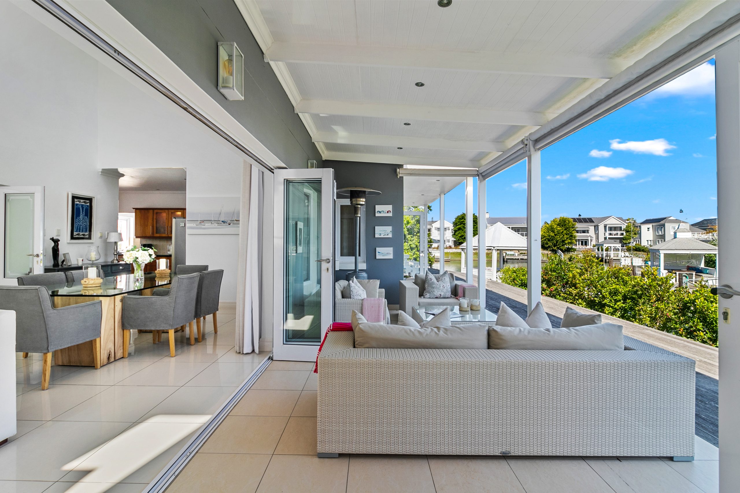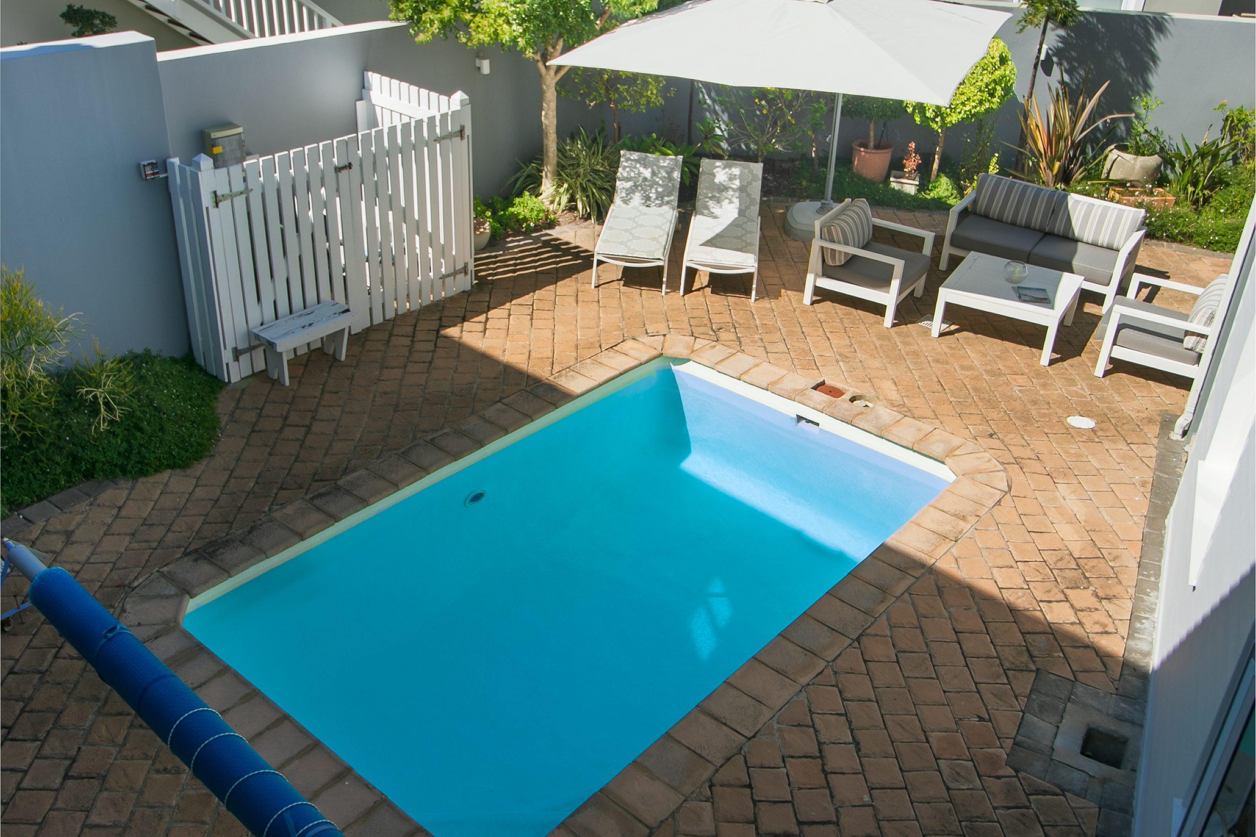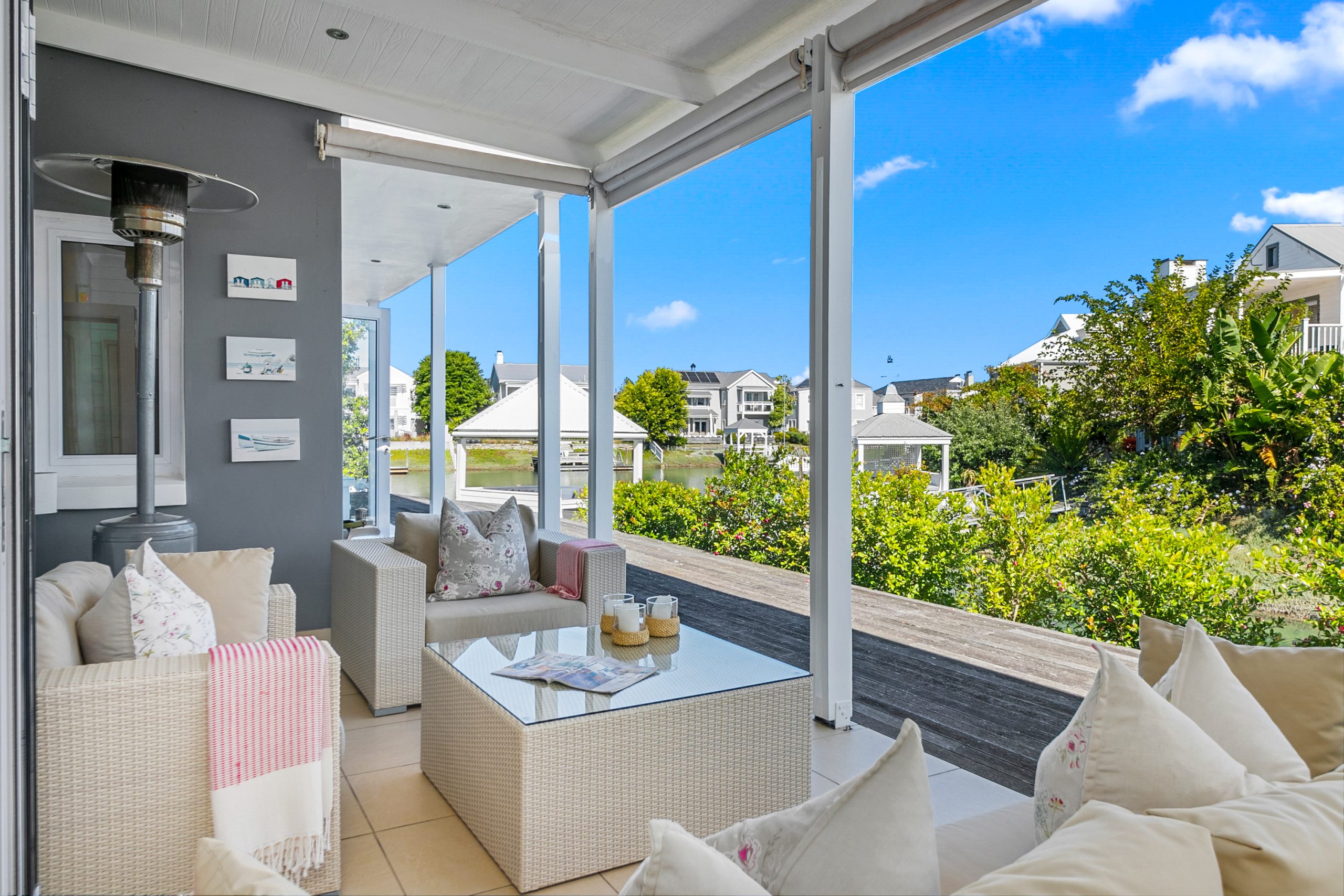 Stacking doors from the living areas open seamlessly onto an expansive outdoor patio with a built-in braai, flowing down to the jetty and gazebo— the perfect setting for waterside relaxation. At the back, a sunny courtyard with a private, heated pool enhances the home’s appeal. An additional small en-suite bedroom at the rear provides versatile accommodation options.